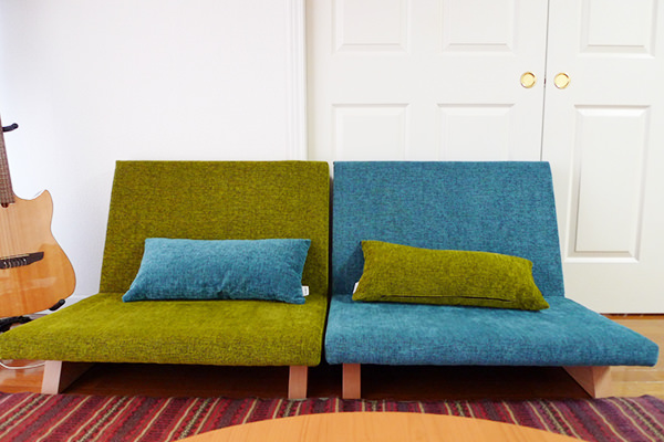 色違いで2台購入しました。くっつけて並べて寝転んでみたり、テーブルをはさんで向かい合わせてお客さんに、ハの字にして二人でくつろいだり、いろんな置き方で楽しんでいます。座面…