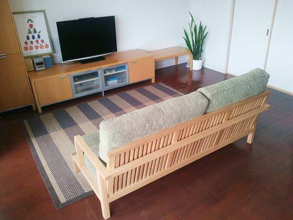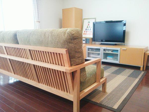 当初、木枠のソファは検討外だったのですが、ショールームで見て一目惚れ。格子のデザインがとても気に入り、購入を決めました。すっきりしたデザインで、サイズの割に圧迫感もなく、…